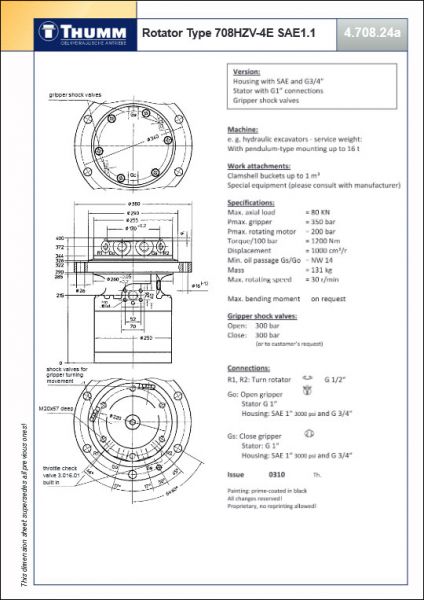 Максимальная осевая нагрузка - 80 кНМакс. давление грейфера - 350 барМакс. давление вращения - 200 барКрутящий момент при 100 бар - 12000 НмРасход масла - 1000 см³/обМин. проход линий открытия/закрытия грейфера - NW14Масса - 131 кгЧастота вращения - 30 об/мин